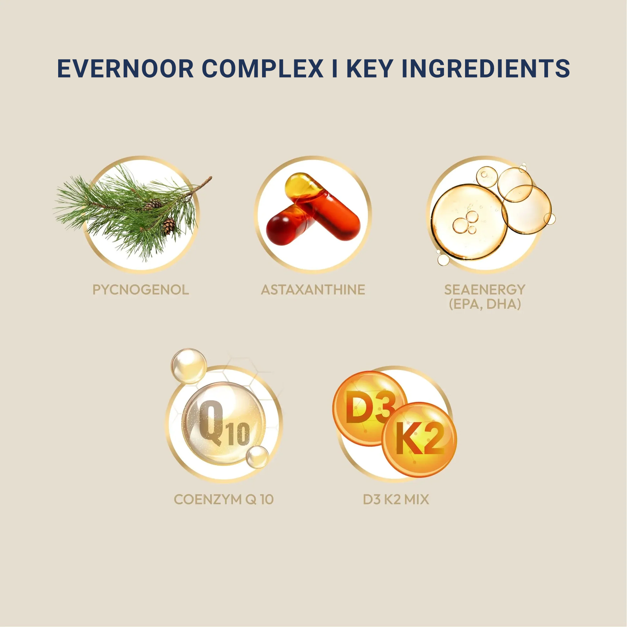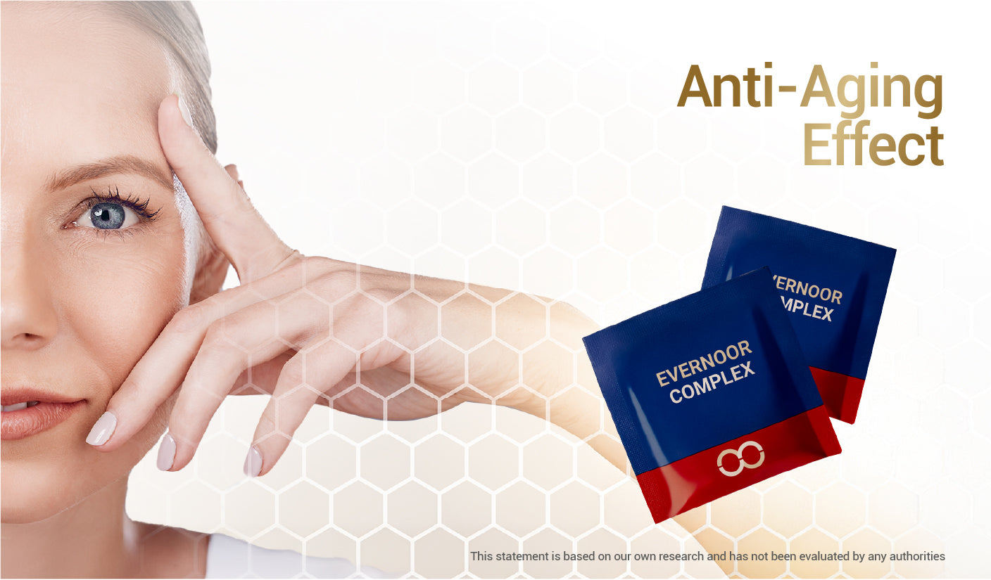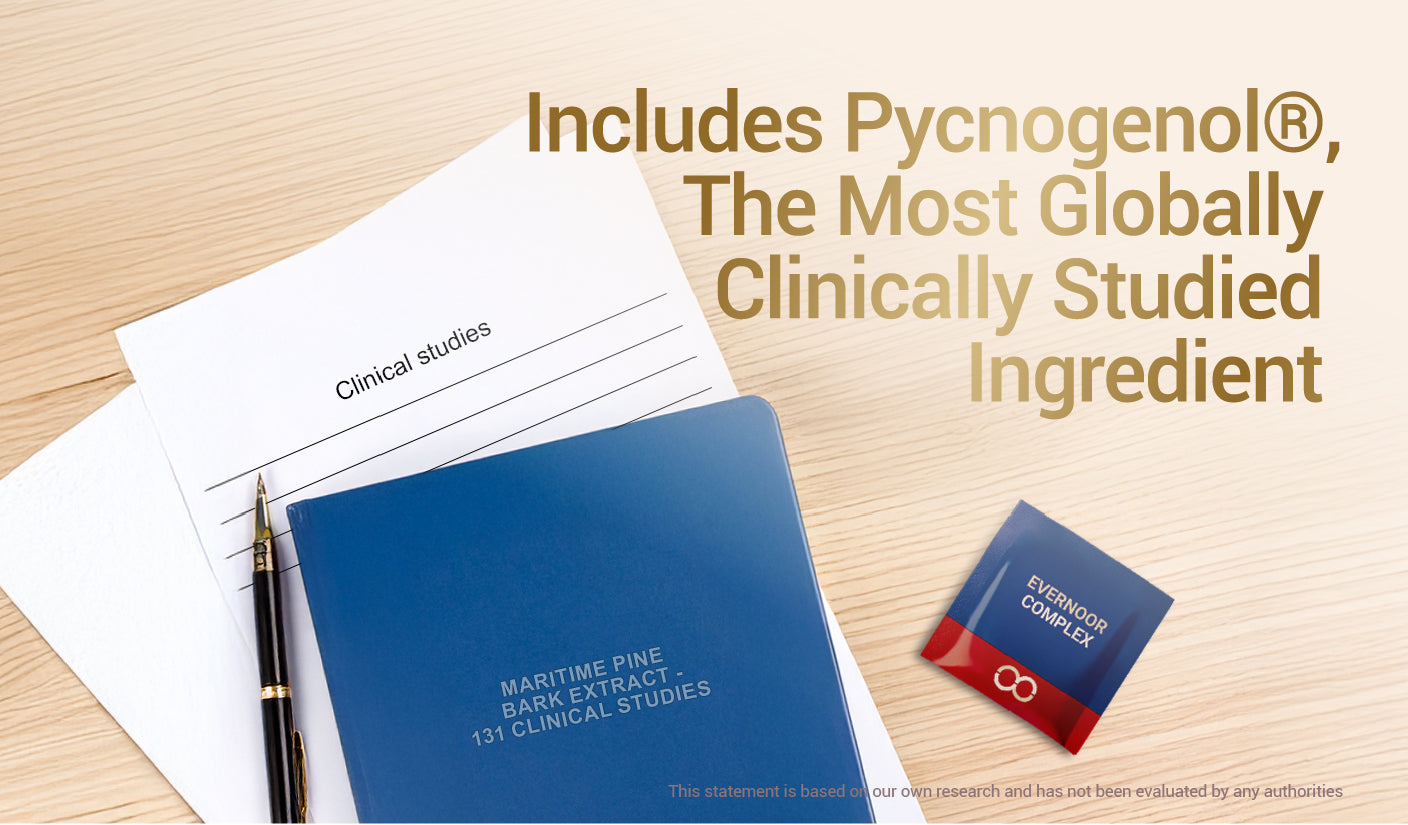 One convenient pouch provides a high antioxidant effect and anti-ageing benefits and includes Pycnogenol®, the world's most clinically studied ingredient. Evernoor replaces 17 supplements with its effortless Swiss formulation.