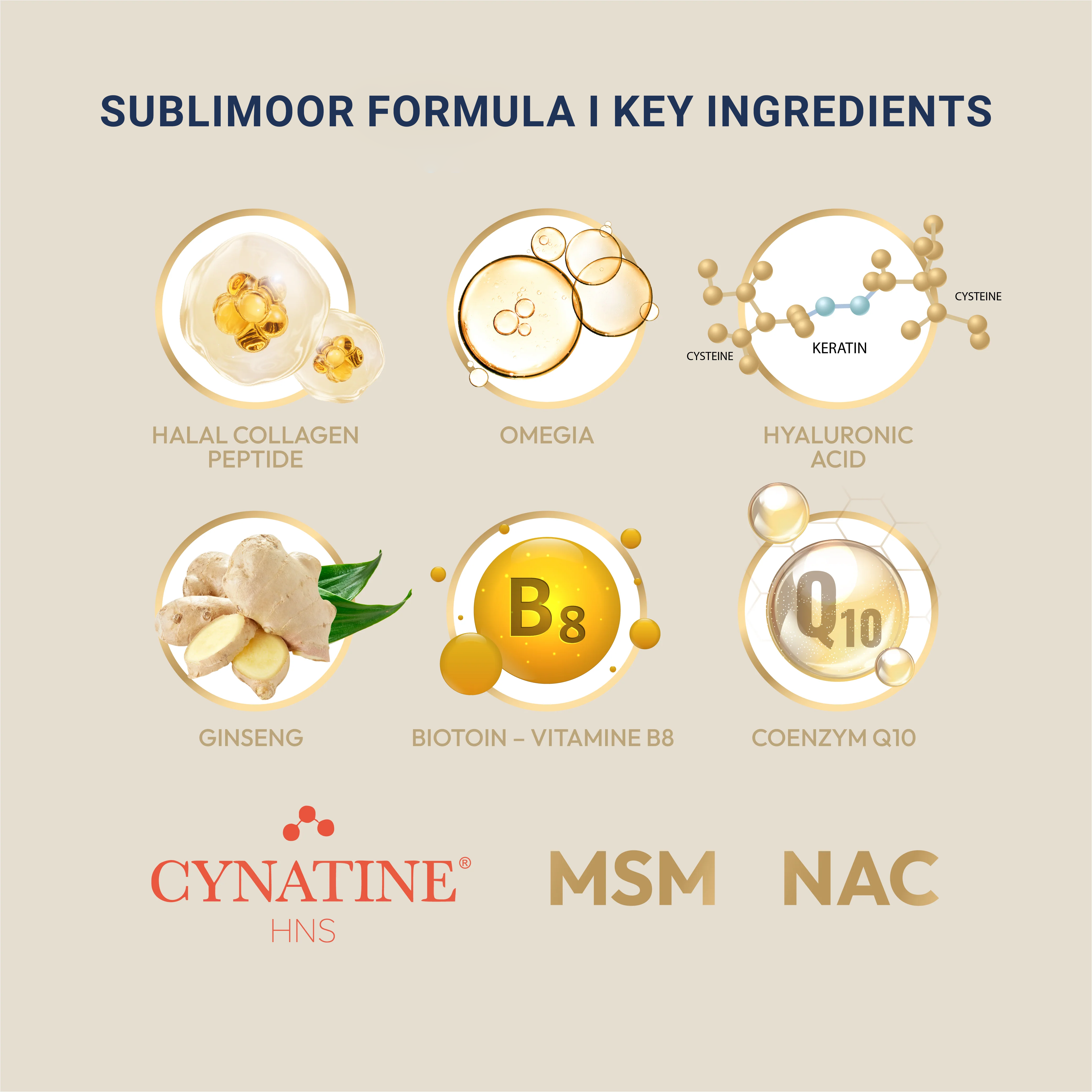 Formulated with halal collagen peptides, omega-3 fatty acids and hyaluronic acid to hydrate the skin and support beauty. It is also enhanced with ginseng, MSM, CoQ10 and biotin (vitamin B8) to provide antioxidant protection and promote cellular health.