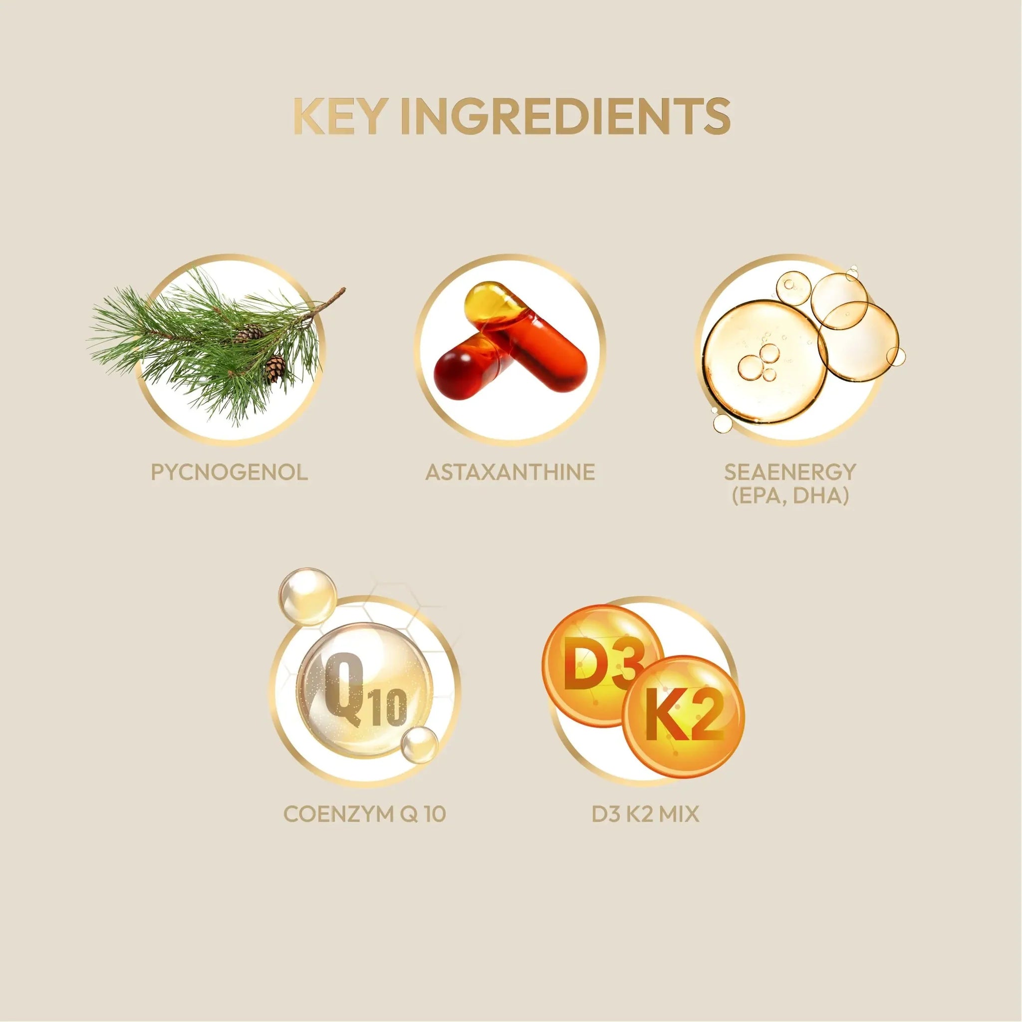 Formulated with Pycnogenol and astaxanthin for powerful antioxidant and anti-aging protection. Enhanced with Seaenergy omega-3 DHA/EPA, CoQ10, and D3K2 mix for comprehensive cellular health and longevity support.